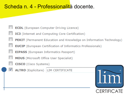 La LIM CERTIFICATE ® andrà inserita nella Scheda Professionalità docente n. 4 nel seguente modo (barrare la casella ALTRO ed inserire la voce LIM CERTIFICATE ®.