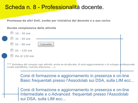 I corsi svolti in presenza e on-line svolti presso l’Assodolab, Ente accreditato dal MIUR, vanno inseriti nella Scheda Professionalità docente n. 8. Occorre selezionare la voce 31-50 ore se il docente ha frequentato il corso Basic in presenza e o quello on-line sia sui DSA, sia sulla LIM o su altri corsi offerti dall’Assodolab; va premuto il riquadro Più di 120 ore se il docente ha frequentato il corso Intermediate o quello Advanced sia sulla LIM, sia sui DSA, sia quelli in presenza, sia quello on-line. In tutti i casi, si tratta di attività formativa svolta presso un Ente accreditato dal MIUR che il docente ha partecipato a suo carico.