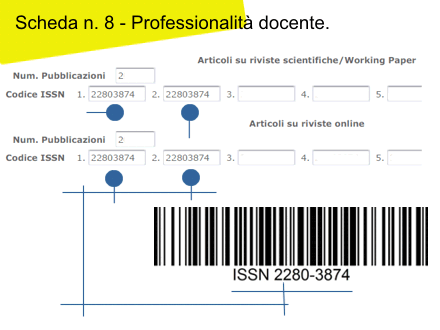 Un’altra parte della Scheda Professionalità docente n. 8 da tener presente e da compilare, è quella riferita agli “articoli su riviste scientifiche”, comunemente detta “Working Paper”. In questo caso, tutti i docenti che hanno pubblicato uno o più articoli sulla rivista cartacea Assodolab potranno indicare sia il numero degli articoli scritti, sia il Codice ISSN 2280-3874 riferito proprio alla rivista Assodolab. Nell’immagine un esempio di quanto detto sulla corretta compilazione.