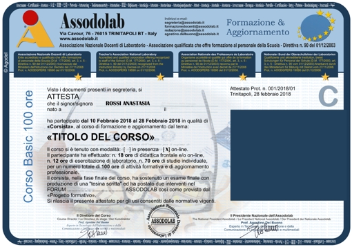L’Associazione Nazionale Docenti di Laboratorio, in sigla ASSODOLAB, con sede legale in Via Cavour, 76 – 76015 TRINITAPOLI BT – Italy, per il corso on-line e per quelli in presenza, denominati Basic, Intermediate e Advanced può stipulare accordi e convenzioni con: Ministero dell’Istruzione, Uffici Scolastici Regionali, Uffici Scolastici Provinciali, Scuole, Istituti scolastici, Regioni, Province, Comuni, Aziende Unità Sanitarie Locali ed altri soggetti.